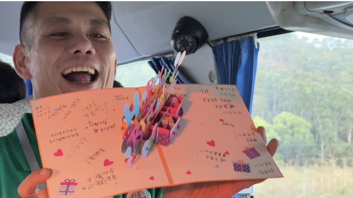 在返程广州的高速上,一根爱心蜡烛被悄悄点燃,一张写满全车人心意、封面印着“HAPPY BIRTHDAY”的贺卡被慢慢打开,“祝你生日快乐”的即时祝福在车厢响起。只因有一位志愿者在出发前向领队提起,朋友这次来参加家访,是想在生日的当天做一件有意义的事情。于是,大家一起准备了这一份简单但心意满满的惊喜,让这个有意义的生日又增添了一些难忘、珍贵的记忆。